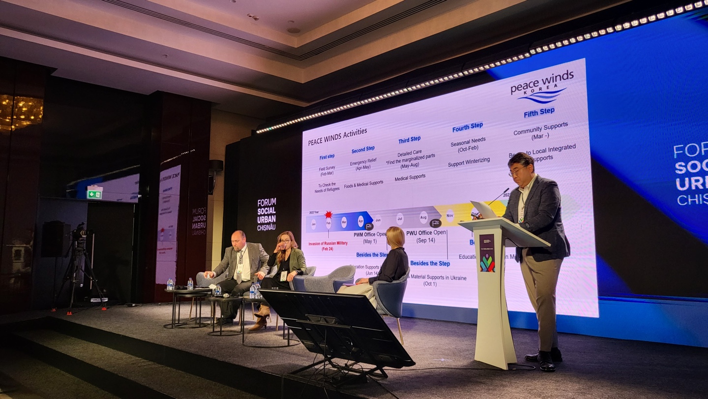 피스윈즈코리아는 지난 5월 4일부터 6일까지 몰도바의 수도 키시나우에서 이루어진 '사회적 도시 포럼'에 참석했습니다. 30개국 100여 명의 연사들이 참석한 이번 포럼은 특히 유럽에서 가장 경제적으로 열악한 국가 몰도바가 우크라이나 난민을 적극 수용하고 다양한 수준의 국제사회적 협력을 이끌어낸 바를 함께 공유하고 추후 발전방향을 논의하기 위해 개최되었습니다. 안전하고 포용적인 도시 피스윈즈코리아는 16개월 간 키시나우 시와 함께 난민을 지원한 경험을 공유하고, 키시나우의 경험을 토대로 앞으로 도시가 어떻게 전쟁 혹은 지진 등 재난 속에서 도시 회복력 및 위기 대응 능력을 기를 수 있는가에 대해 발표하였습니다. 특히, 난민들이 안전하게 지낼 수 있는 피난소를 유지하고 재난 발생 시 상호 간 빠르게 도움을 주고받을 수 있는 국내외 파트너를 유지하는 것이 필요함을 강조하였습니다. 피스윈즈코리아의 지원 기록 ️️ 약 80,000명의 난민에게 배분된 100,000개의 생활키트, 100명에게 제공된 10개의 난로, 3개월간 900명의 난민 환자를 진료한 임시 진료소, 반려동물 3,000마리에게 제공된 약 30톤의 사료 및 8,500개의 반려동물 의료용품을 지원하였습니다. 장기화되는 전쟁에 많은 NGO들은 몰도바를 떠나고 국제사회의 추가적인 지원을 기대해야하는 상황이지만, 피스윈즈코리아는 여전히 도움이 필요한 사람들을 위해 지원을 이어가도록 하겠습니다. 앞으로도 몰도바 내 우크라이나 난민 지원을 위해 피스윈즈코리아가 나아갈 행보에 많은 관심을 부탁드립니다.